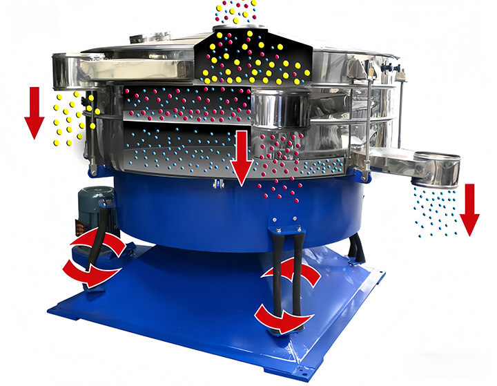 1、回旋式筛分:两层同样孔径的筛网,让筛过一次的物料再次筛分,以达到更高的筛分精度。